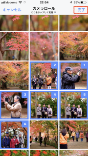 ●カメラロールの一覧から、アップロードしたい写真をタップします。選択ができたら「完了」をタップします。