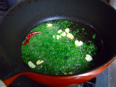 2.オリーブオイルとニンニクをフライパンに入れて弱火にかける。ニンニクがきつね色になってきたら鷹の爪、パセリを入れてなじませる。