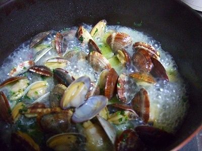 3.あさりと白ワイン(酒)を入れたら、ふたをして強火にする。