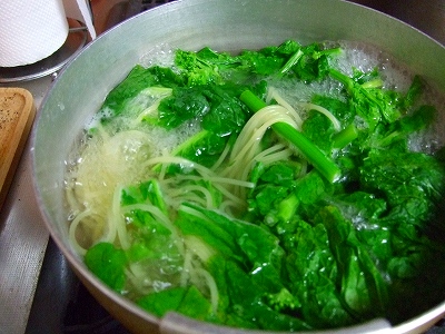 5.1のパスタが茹であがる2分前位に菜の花を入れる。