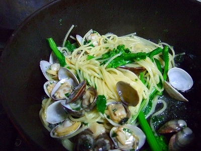 6.一旦取り出したあさりを4に戻し、茹であがったパスタ・菜の花も加えて、パスタにスープを絡ませる感じで少しだけ煮込んだら火を止める。