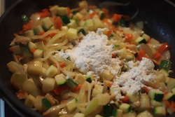 - 全体にバターが馴染んできたら、小麦粉を振り入れて、粉気がなくなるくらいまで炒める。