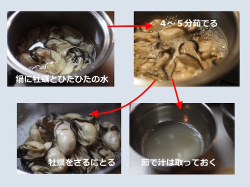- 1の牡蠣を鍋に入れて、浸かるくらいに水を入れて火にかけ、5分程度茹でる。