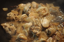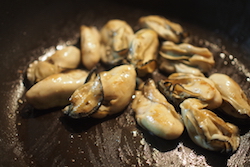 - 牡蠣に軽く火が通ったら、白ワイン(酒)を加えてさらに炒める。
