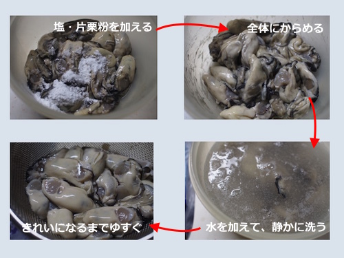 塩と片栗粉で、牡蠣の汚れやぬめりを綺麗に落としてから使いましょう。