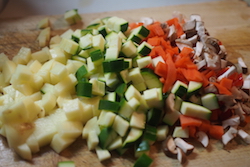 - 玉ねぎ〜ジャガイモまでの材料は、粗みじん切りにする。