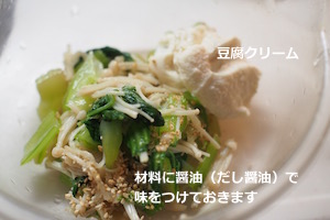 - 1.をボウルに入れて、ほんの少しだけ醤油(だし醤油)をまぶしておく。
