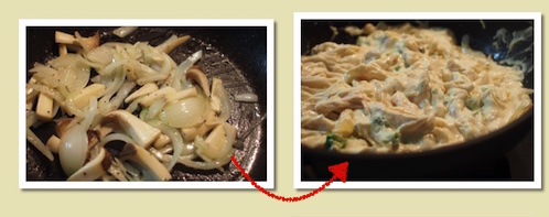 - 1.に火が通ってしんなりしてきたら、茹でたマカロニと豆腐クリームを入れる。