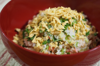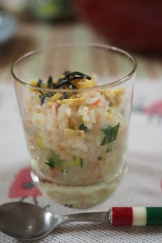 - 1.のご飯が炊き上がったら、寿司酢を混ぜてすし飯にして、薄焼き卵以外の材料をざっくりと混ぜる。