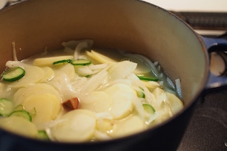- 全体にしんなりとしてきたら、水とコンソメを入れてジャガイモが柔らかくなるまで煮る。