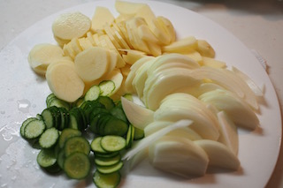 - ジャガイモ、キュウリ、玉ねぎは薄切りにする。