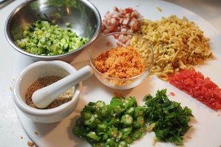 - キュウリは粗みじんにして塩を振りしばらく放置。水分が出てきたら軽く絞っておく。
