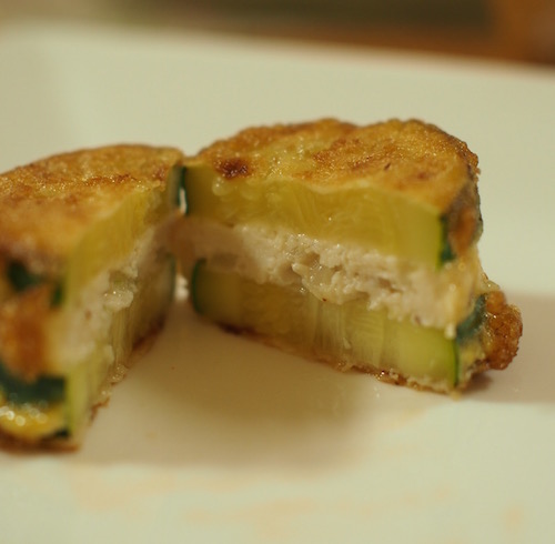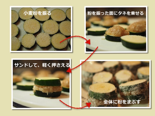 - 小麦粉を振りかけた面に小さじ1ほどの1.を乗せて、もう1枚のズッキーニをのせて具材をサンドする。全体に軽く小麦粉をまぶす。*小麦粉が糊の代わりになります。
