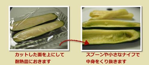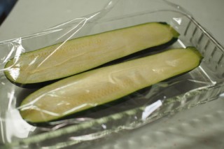 - ズッキーニは縦半分に切り、耐熱皿に乗せて軽くラップをして、電子レンジで3分ほど加熱する。