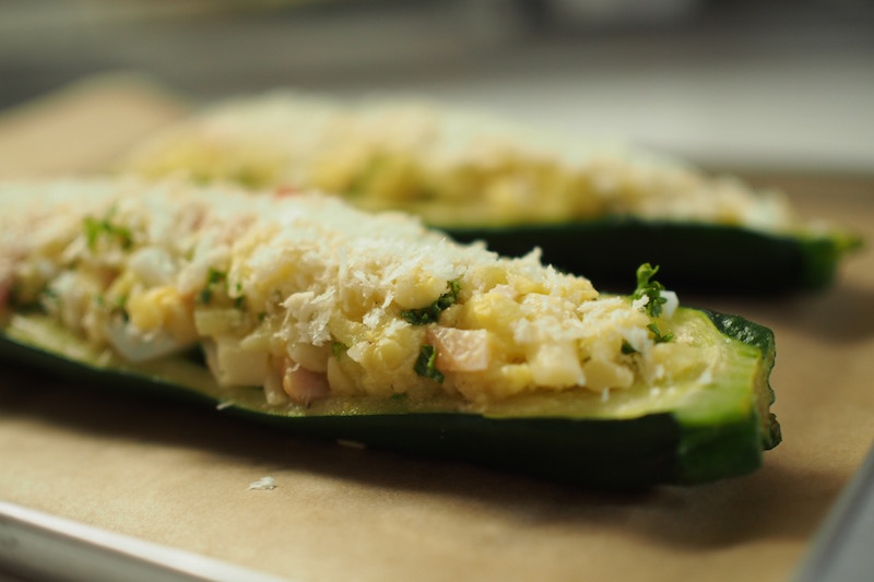 - オーブントースター用のトレイにオーブンシートを敷き2.のズッキーニを並べ、3.を詰める。手で軽く押さえて、こんもりとした感じにして、その上にパン粉を振る。