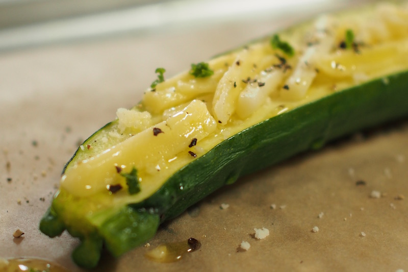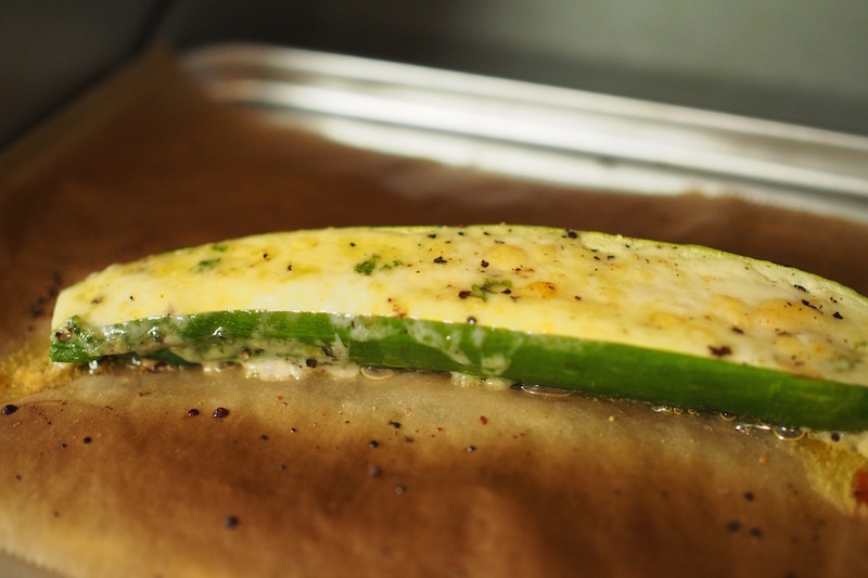 - オーブントースター用のトレイにオーブンシートを敷き1.のズッキーニを並べ、パルメザンチーズ、シュレットチーズをのせる。