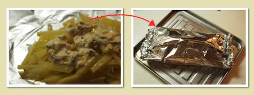 - オーブントースターに入れて、10分ほど蒸し焼きにする。