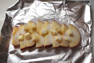 - カットしたアルミホイルにバターを薄く塗り、カットしたりんごを並べる。