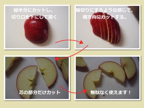 - りんご半分は皮を残したまま5mmくらいにスライスする。