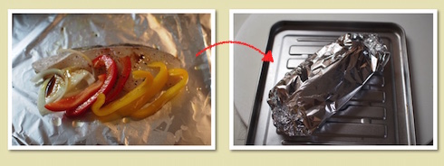 3. スライスした玉ねぎ・パプリカを添えてアルミホイルを閉じる。