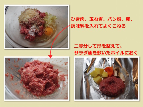 - 2等分にしたタネを空気を抜きながら形を整えて、サラダ油を薄く敷いたアルミホイルの上におきます。