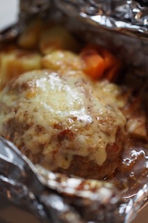 - オーブントースターで12〜3分加熱。一旦、ホイルを開けてデミグラスソースを肉の上にかけます。再度、アルミホイルを閉じて、5分ほど蒸し焼きにすれば出来上がり。