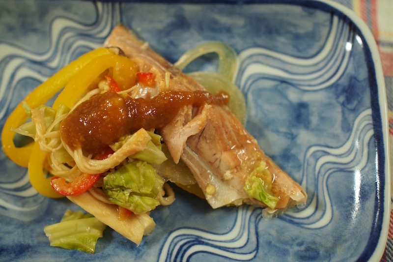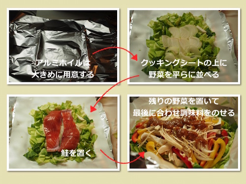 - キャベツ、玉ねぎをクッキングシートの上に並べ、中心のあたりに鮭を置きます。さらに、残りの野菜も高さを揃えるようにおき、最後に合わせた調味料を(少し残して)のせる。