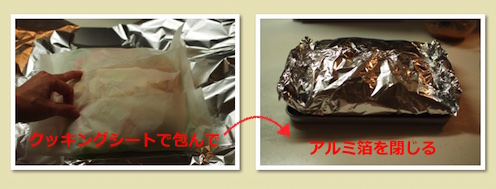 ※クッキングペーパーでなくて、新聞紙でもOK。 - さらにアルミホイルで包み、オーブントースターで30分ほど加熱。