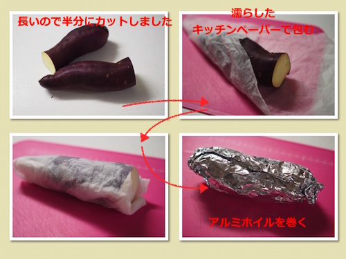 - さつまいもはきれいに洗い、濡らしたクッキングペーパーで包む。