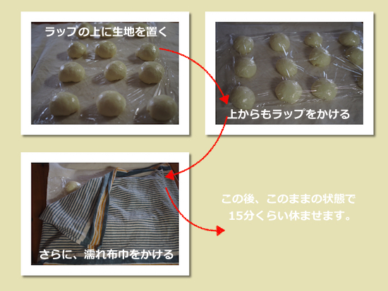 - 手に油をつけて生地を丸め、ラップの上に並べる。