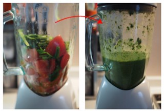 - 1.のほうれん草とざく切りにしたトマトをミキサーにかけてペースト状にする。
