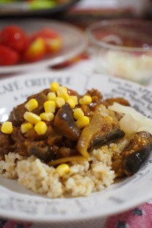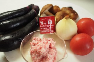 - ミンチを入れて炒め(中火)、肉の色が白っぽくなったら玉ねぎを加え、さらになす→しいたけ→トマトの順に入れながら全体を混ぜ合わせる。