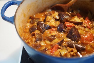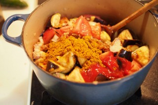- カレー粉、しょうゆ、ウスターソース、ケチャップ、酒を加えて、全体になじませたら蓋をして、ナスが柔らかくなるまで弱火で煮る。(約10分)。