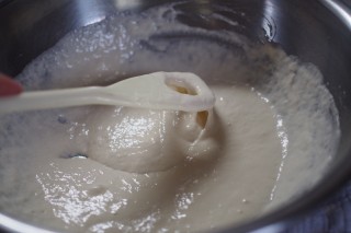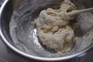 - 大きめのボウルに強力粉とドライイーストを入れて軽く混ぜ、1.を加えて、ヘラなどを使って3分ほどかき混ぜて、ダマがなく粘り気が出てくる状態にする。