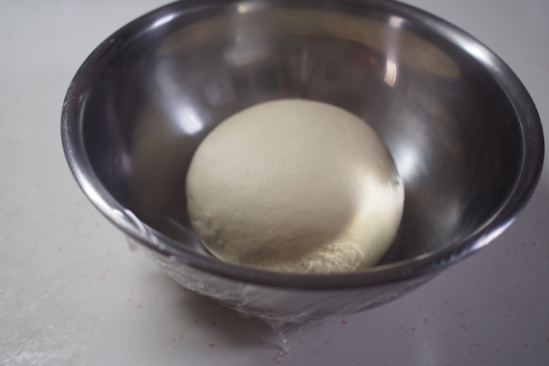4.の作業を参照 - ボウルの内側にオリーブオイルを薄く塗って7.の生地を入れ、ラップをする。