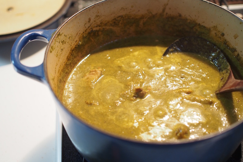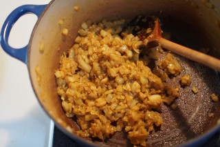 - 深めの鍋にサラダ油大さじ2を熱して玉ねぎを炒め、透明になってカサがへつてきたら生姜、カレー粉、塩を入れて香りが出るまで炒める。油が足りない時は、途中で足してください。
