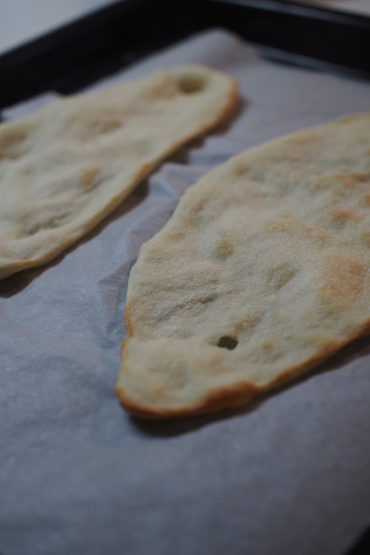 ※焼きあがったナンはまな板などに取り出し、粗熱が取れたらビニール袋に入れるかキッチンタオルなどで包んで、乾燥しないように気をつけます。