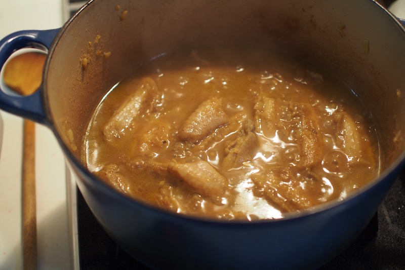 - 鶏肉を加えて表面が白っぽくなる程度まで炒めたら、ブイヨンと200ccの水を加えて中火で煮る。沸騰したら火を弱めてアクを取り弱火にして(蓋をして)煮込む。