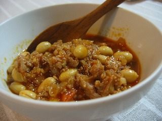 - 肉に火が通ってきたら大豆(缶詰の汁ごと)、トマト、ナンプラー(orしょうゆ)、塩、ブイヨンを入れて全体を大きくかき混ぜて材料をなじませる。蓋をして弱火で10分ほど煮込む。最後にあらびきコショウをふりかけて出来上がり。