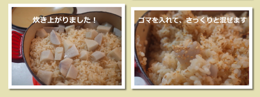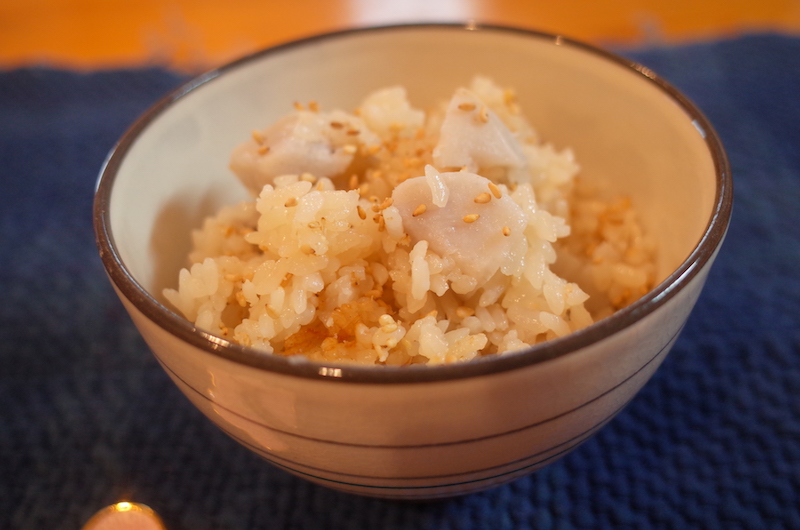 - 鍋に米を入れ、水、塩、醤油、酒、里芋を加えて、ざっくりと混ぜる。