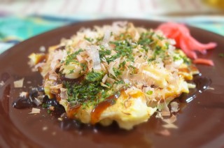 - お皿に盛って、ソース、青海苔、天かすをかけていただきます。お好みで、マヨネーズ、紅生姜なども!