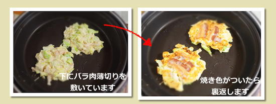- フライパン(ホットプレートでもOK)を温めてサラダ油を薄く敷き、その上に4.の生地を丸く流し入れる。(豚肉を入れるときは、生地を流し入れる前に2枚ほど並べておきます。)