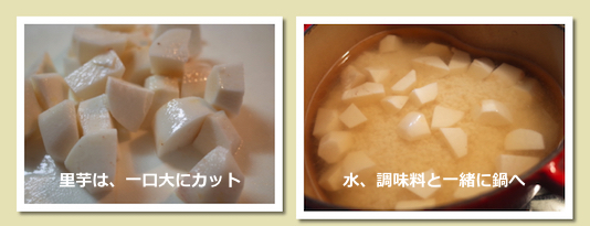 - 里芋は洗って汚れを落とし、一口大にカットする。