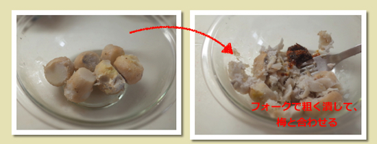 ※このままで、塩をつけていただいても美味しいです♪ - 3.の里芋をボウルに入れてフォークを使って粗くつぶし、2.を加えてよく混ぜる。