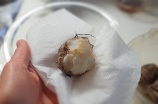 - 1.の余熱が取れたら皮を剥く。手でつるんと剥けます。