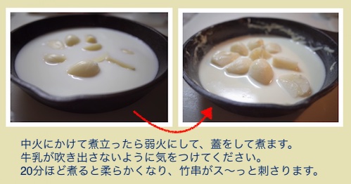 - にんにくは小房に分けたらを半分に切り、(芯があれば芯を取って)ひたひたの牛乳とともに鍋にいれて火にかける。ほくほくした感じになるまで、20分くらい煮る(にんにくの臭みを取ります)。