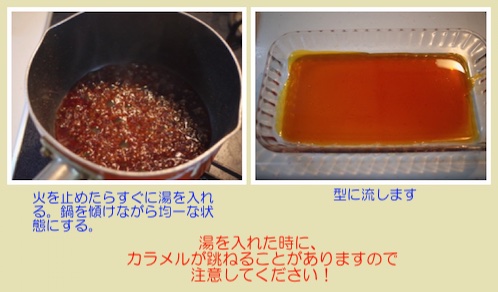 小さな鍋にグラニュー糖と水を入れ強火にかける。グラニュー糖が溶けて(お鍋の縁あたりが)茶色くなってきたら、鍋を傾けながら全体が均一な焦げ茶色になるように調整する。香ばしい香りもしてきたら、火を止める。その後すぐに湯を注き、鍋を傾けて全体をなじませ、型に流しておく。*カラメル化するまでは、木じゃくし等で混ぜないでください。