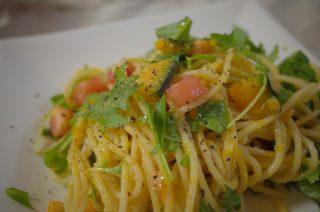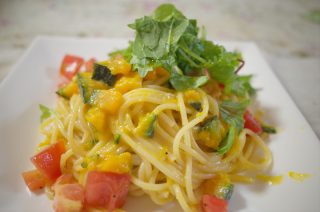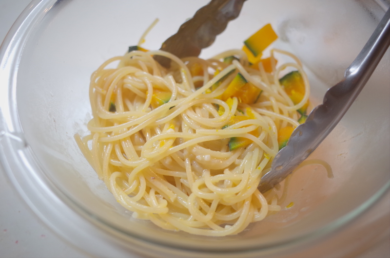 - パスタが茹で上がる3分前にカボチャを加えて一緒にゆでる。