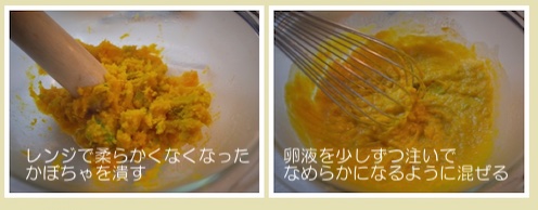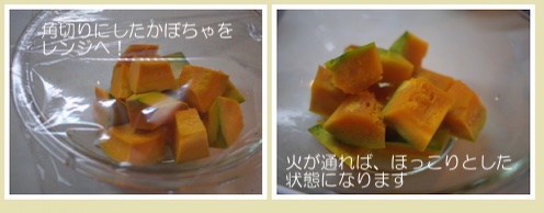 - カボチャは適当な大きさの角切りにして皮を剥く。これを耐熱容器に入れて、大さじ1くらいの水を振りかけて軽くラップをする。→600wのレンジで5~6分加熱する。