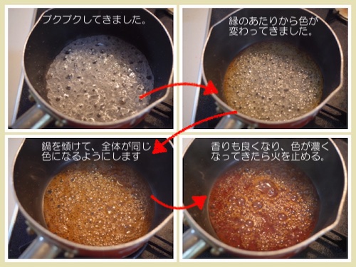 - カラメルソース は、電子レンジでの作り方が簡単なようです。ただ、電子レンジの使い方に慣れなくて、ついつい旧式な作り方をしてしまいます^^;